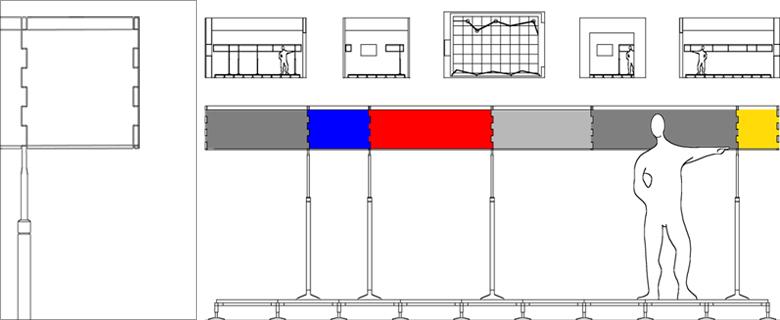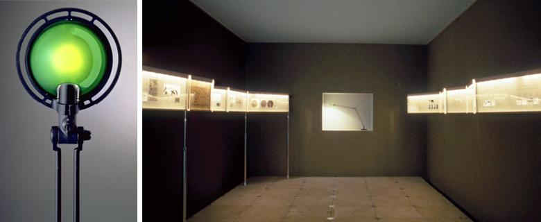 La lampada Berenice, posta al centro del percorso espositivo in una bacheca/teatro, viene raccontata nell’insieme e nel dettaglio scomponendola nelle sue parti ed analizzandole una per una. Per fare questo è stato studiato un particolare sistema espositivo a leggio, basato su un modulo A3 orizzontale, composto da elementi di varia lunghezza incernierati fra di loro, posti all’altezza dell’occhio e sostenuti da supporti telescopici o fissati direttamente alle pareti. Il leggio è illuminato linearmente dal davanti e contiene piccole vetrine espositive retroilluminate.