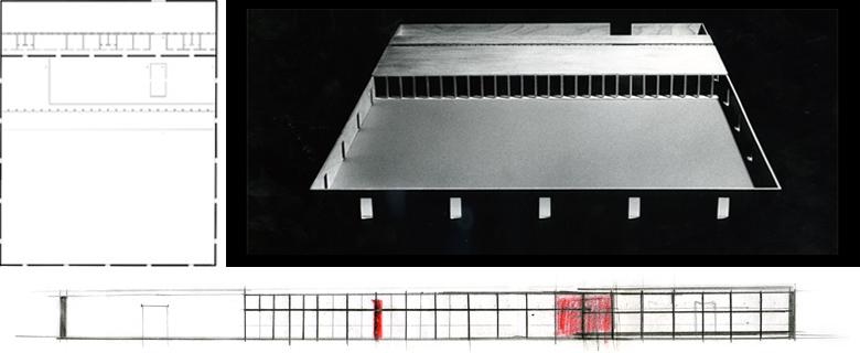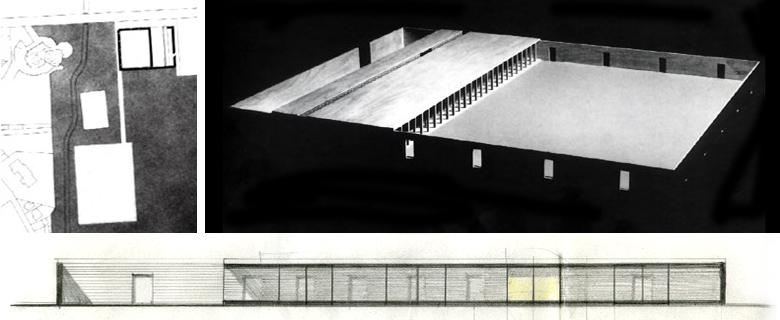 Un recinto come elemento di identificazione di un luogo. Una parte dell’area compresa nel recinto è coperta e chiusa (aule comuni). Il rimanente dell’area è aperto (il giardino). Il confine fra le due parti è costruito da una fila di pilastri che sorreggono la copertura e da una vetrata continua. Sotto lo stesso tetto piano, appoggiato sui pilastri e sul muro di cinta, un’area coperta ma aperta. Sulle sale comuni affacciano direttamente una serie di locali di servizio disposti in linea, che sul retro prospettano su un piccolo cortile intorno al quale si conclude il recinto.