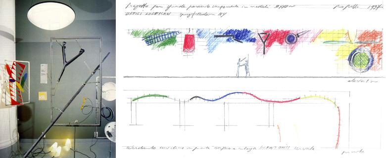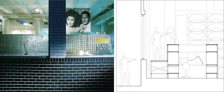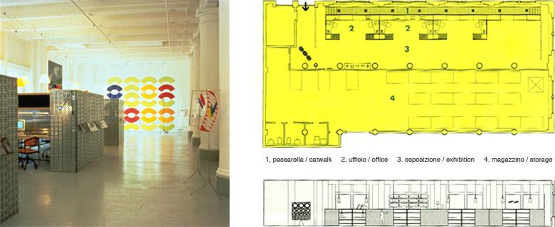 Lo spazio di vendita come luogo per la conoscenza del prodotto. Il diaframma tra esterno ed interno, in pannelli di lamiera traforata, che risolve le divisioni tra vetrine, reception, uffici e zone espositive, è preceduto da una passerella più alta del livello stradale: luogo allo stesso tempo per esposizione ma anche per un istruttivo percorso dei visitatori che potrà creare curiosità anche nei passanti all’esterno. Un grande schermo traslucido, composto dai semilavorati serigrafati dei paralumi della lampada Costanza, fa da fondale scenografico e agisce come filtro colorato alla luce.