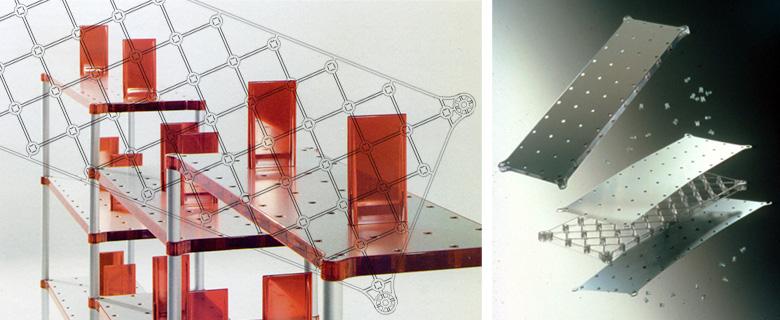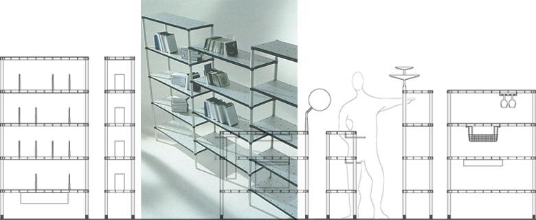 con A. Medaù kartell.itSistema modulare di scaffali, composti da una struttura tubolare in alluminio e da ripiani compositi nati dall’accoppiamento funzionale di due materiali, la plastica e l’alluminio. Uno strato alveolare di plastica trasparente colorata è inserito tra due fogli di alluminio estruso anodizzato, collegato tramite chiodi cavi anch’essi in plastica trasparente. Facile da montare e facilmente divisibile per il riciclo al termine del suo periodo di utilizzo. Nelle cavità dei chiodi si agganciano una serie di accessori che rendono il sistema adatto a tutti i luoghi della casa.