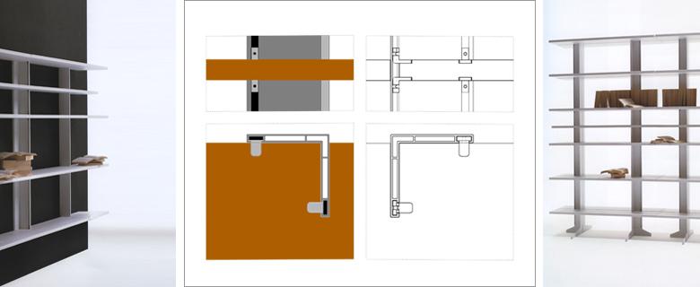 SegisAlla base del progetto è l’idea di combinare un “allargamento” il più completo possibile di soluzioni tipologiche e distributive, con la “riduzione” al minimo degli elementi che compongono il sistema. Il problema è stato risolto con l’utilizzo di solo 2+1 componenti: un trafilato in alluminio 10x10x1 cm, una serie di ripiani in mediumdensity opportunamente sagomati e verniciati, un elemento di supporto in pressofusione di zama per connetterli. La forma a L e le dimensioni del profilato fanno sì che combinato saldamente col ripiano formi una solida struttura portante.