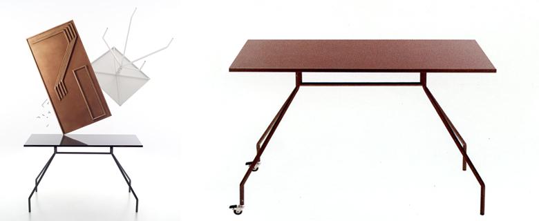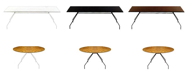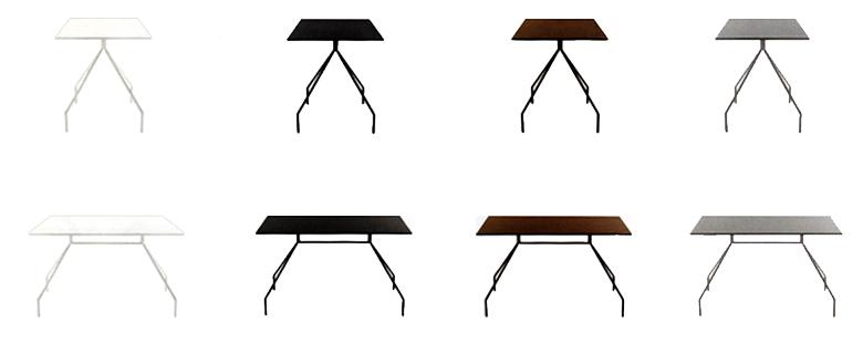 danesemilano.comSerie di tavoli modulari in diverse misure, in diversi colori e in diverse finiture, anche su ruote. La struttura è in metallo verniciato o zincato, mentre il piano, quadrato, rettangolare o tondo, è in lamiera prezincata verniciata o in pino derullato lucidato. Il tavolo si compone di quattro gambe uguali in tubolare quadrato piegato che si avvitano al piano tramite una struttura di irrigidimento, diversa a seconda della dimensione del piano. Facilmente smontabile, una volta disassemblata, la struttura è contenuta nello spessore della lamiera, agevolando il trasporto.