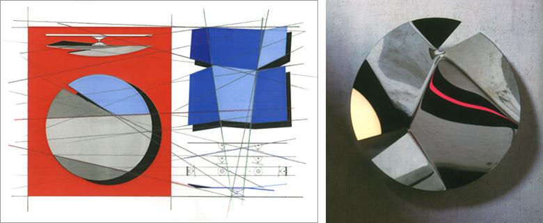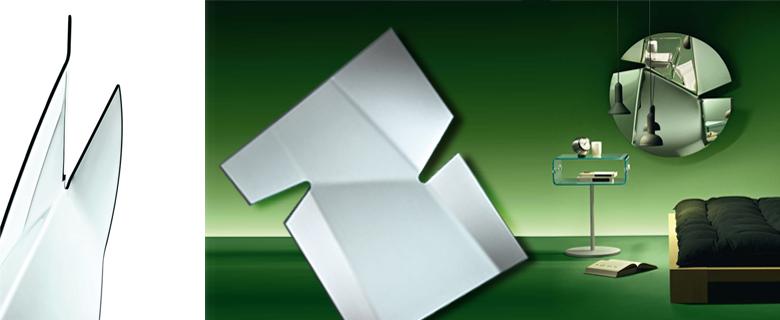 Lo specchio da parete, non più un’unica superficie riflettente, acquista pluralità e divergenza dei punti di vista. Procedendo per pieghe, Hasami alterna rispecchiamento e distorsione. Nelle versioni tonda e quadrata, è in vetro curvato argentato da 6 mm, orientabile tramite snodo posteriore in acciaio inox.