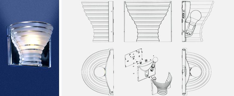 Serie di lampade a parete composte da una sagoma in vetro stampato montata su una piastra in acciaio inox specchiante. Il diffusore in vetro trasparente chiaro, dalla forma tradizionale, è sagomato su centine concentriche sabbiate o metallizzate, che riprendono la tecnologia e la forma delle lenti Fresnel, per diffondere il bagliore della sorgente di luce senza abbagliare con la vista della lampadina.