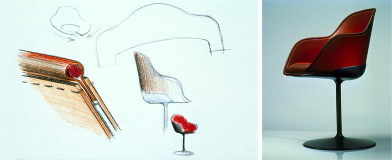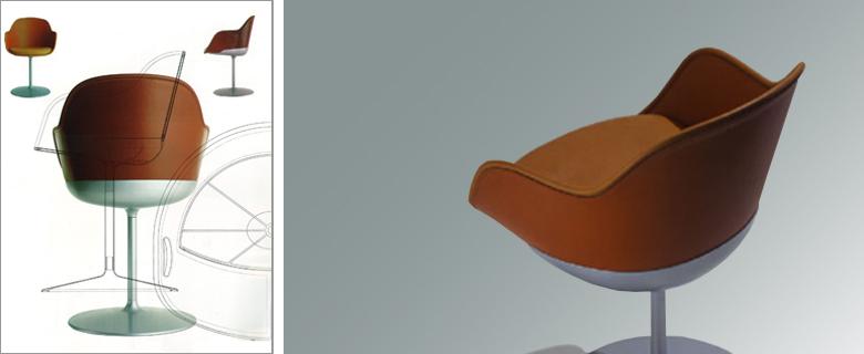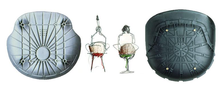 cassina.comUn’unica scocca in cuoio si raccorda a un guscio in pressofusione di alluminio, su cui si innesta lo stelo che fa da basamento. Il problema tecnico consiste nella composizione di mondi tecnologicamente differenti. La pressofusione d’alluminio risolve la complessità dei dettagli con un unico processo di stampaggio. Il sandwich di due fogli di cuoio con uno centrale in polipropilene ed il sistema di aggancio desunto dal campo elettrico risolvono il problema della connessione delle parti. L’invenzione della forma nasce dalla sperimentazione e dall’accostamento dei materiali.