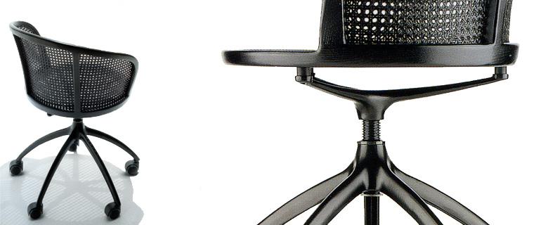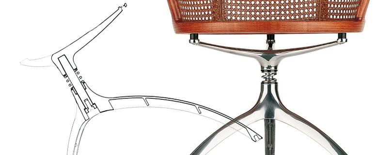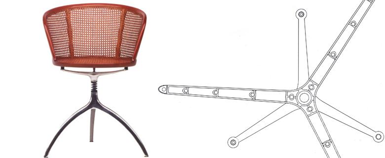 aliasdesign.itLa serie di oggetti pensata per Alias, prendendo come spunto la consolidata tipologia del treppiede, introduce un gioco particolare di relazioni che si potrebbero definire “pericolose”. Il progetto della poltroncina con-pone in un processo di ibridazione, due parti solo apparentemente distinte dal punto di vista della memoria formale: il treppiede rotante in pressofusione leggera di alluminio, munito di un meccanismo ammortizzante in vista, e la scocca avvolgente in paglia di Vienna, tesa su un telaio in massello di faggio piegato a caldo e lavorato.