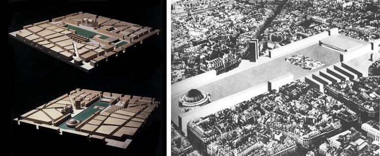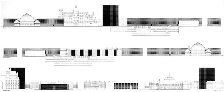 Il luogo è definito sui due lati corti da due edifici pubblici, uno antico e uno di nuova costruzione, e sui due lati lunghi da due cortine residenziali interrotte nei punti in cui i tessuti circostanti possono evidenziare i loro caratteri. Tutto ciò in un sistema di relazioni fra i lati nord e sud che sono già presenti nell’antico tessuto urbano. Relazioni che si stabiliscono attraverso il prato, che diventa il luogo dei punti di vista di tutti questi elementi urbani, antichi e nuovi, riconnessi in uno in cui si rappresentano.