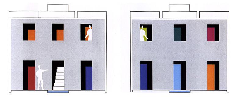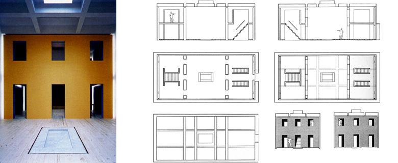 This house, virtual development of a real house built on a Mediterranean isle, is the staging as if in a theatre, of an essential dwelling. Essential not in the sense of minimal but in the more particular significance of the idea of inhabiting. As in a traditional Italian house, the layout develops simmetrically, some coloured walls highlight and mark the divisions. Different sound perspectives, room after room, define the sounding space and compose an entire musical performance in the big central space.