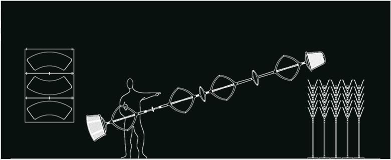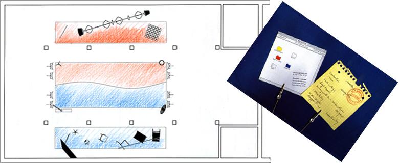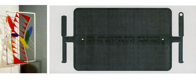 The installation shows the many designed and produced objects by Meda and Rizzatto, disassembled to their components and then freely ri-assembled. To the left on a blue linoleum surface Meda’s objects, to the right on a red linoleum surface those by Rizzatto; in the center, four lamps, designed together by the two designers, are shown in their entirety. Beside them eight music stands hold their components, instead of music paper, as pictures in their frame.