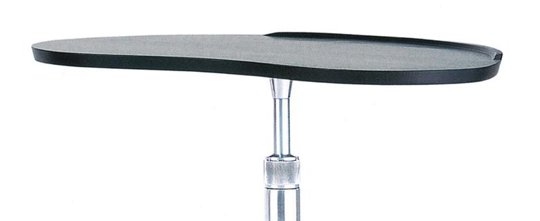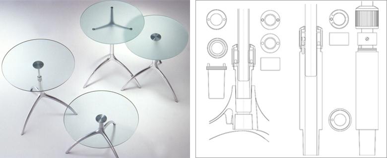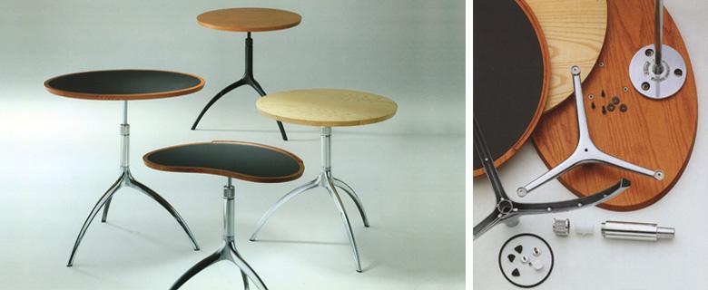 alias.designDesign of an object, as of a building, is a composite work. The various parts must be put together. The table design composes a rotary height-adjustable tripod in light aluminium die-casting, with different sized and shaped tops, made of slate, glass, beechwood with linoleum inlays, or solid cherrywood.