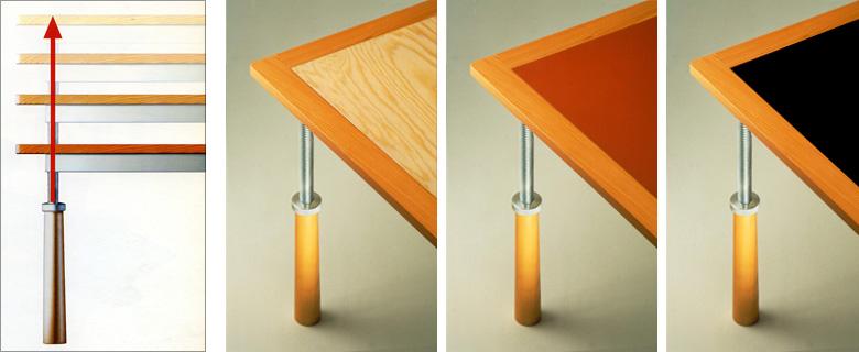 NemoThis table doesn’t conceal the simple mechanism for height adjusting. On the opposite, the beauty and quality of metalwork shown by screw and ring nut lock, give character to the legs and thus to the whole table. When used as dining table, it adjusts in height to fit to any kind of seat (ancient or modern chairs, armchairs and sofas) and can be lowered as much as to turn it into a coffee table to be placed in front of the living room sofas.