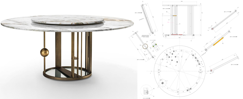 Il piano di marmo sembra invece galleggiare sostenuto da una insolita struttura sorprendentemente ricca e leggera, ariosa e cangiante al variare dei punti di vista.