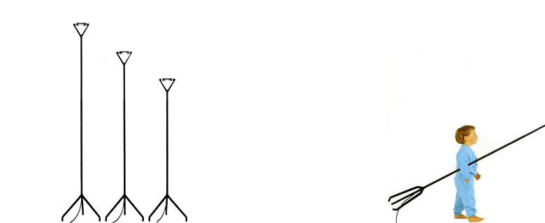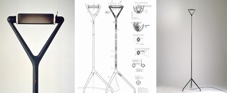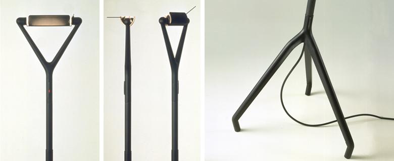 con A. Medaù luceplan.itCompasso d’Oro Award 1989 / Forum Design Award 1988 / Telescopic carbon fibre or aluminium rod, articulated tripod base, fibreglass-reinforced techno polymer heat resistant head, micro perforated steel diffuser, pyrex glass protected halogen lamp: a blend of complex technologies and basic simplicity of form. A new vision of floor lamps. The lightness of shape and materials allows this lamp to be mooved freely and handily. The light can be adjusted in height by mean of the telescopic stem. The reflector can be directed through the use of a rod and emits diffused or direct lighting at will.