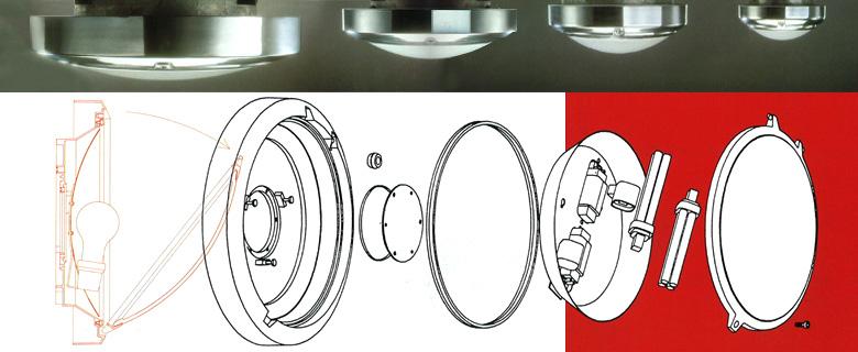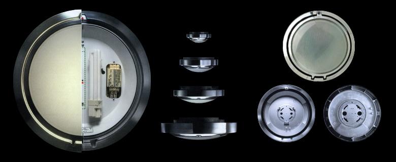 con A. Meda, R. Sarfattiù luceplan.itCompasso d’Oro Award 1994 / A sober ceiling fixture that allows choosing the most suitable light source, from the incandescent, to the halogen and fluorescent lamping. The die-cast aluminium body boasts a series of interchangeable reflectors, assembled with the necessary electrical components. The diffuser is unbraekable, opaline polycarbonate, UV-rays-resistant, or in stamped glass with a prismatic, honey-comb pattern – sandblasted to guarantee a high efficienty. Some inner reflectors are equipped with an emergency light. Provided with IP-65 KIT for out-door application