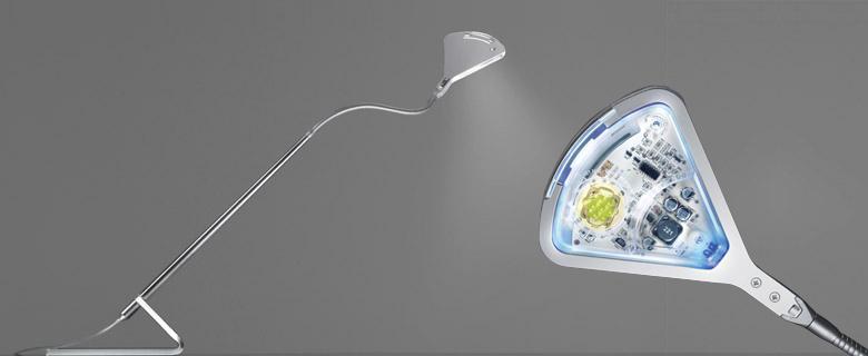 con A. Medaù luceplan.itCompasso d’Oro Award 2008 / Good Design Award 2007 / Design Plus Prize 2006 / Lights of the Future Prize 2006 / Innovazione Amica dell’Ambiente Award 2005 / A sophisticated reading lamp with a lightweight frame that uses the new LED Chip on Board technology. A series of multicolor diodes produce an intense, warm and pleasing lighting with very low consumption (only 5W) and an average duration of some 50,000 hours (against 2,000 hours of a normal halogen bulb). When it is switched off, its profile is illuminated with a blue light so that it can be found even in the dark.
