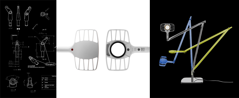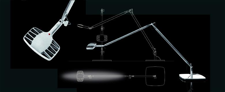con Alberto Medaù luceplan.itTable lamp designed around its 8W LED lighting source. Unlike previous LED sources this LED supplies an excellent quality of light, variable in intensity and in color temperature (from cold to warm light through a simple rotation of the round diffusor). As the operating temperature strongly affects LED lifespan, this lamp head is designed perforated in order to dissipate heat and at the same time to be gripped and oriented without burning one’s hand. Attention is focused on the reduction of material, dimension, formal complexity and visual impact. Balance mechanics of the arms are deliberately unemphasized. To facilitate end of life recycling (although LED lifespan is 50000/60000 hours) the lamp is built with a single material, extruded aluminum for the arms and die-cast aluminum for the articulated junctions, the head and the base.