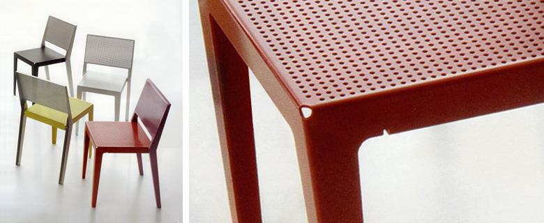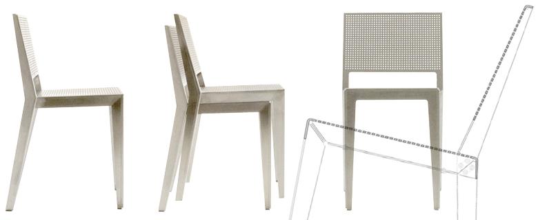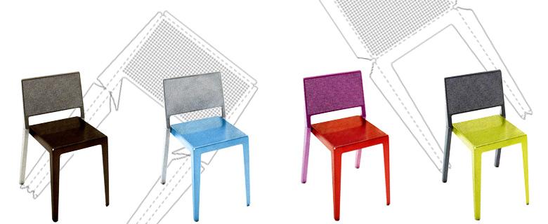 danesemilano.comA stackable chair, made of a single 3mm thick aluminium sheet. ABChair is an emblematic expression of intelligent resource usage. Made entirely of aluminium, the structure is laser cut into a fork shape, to reduce material wastage and weight, and moulded with the fewest possible bends and welds. The result is a functional and recyclabe chair that is very easy to use. The aluminium is anodized in various colours before manufacturing.