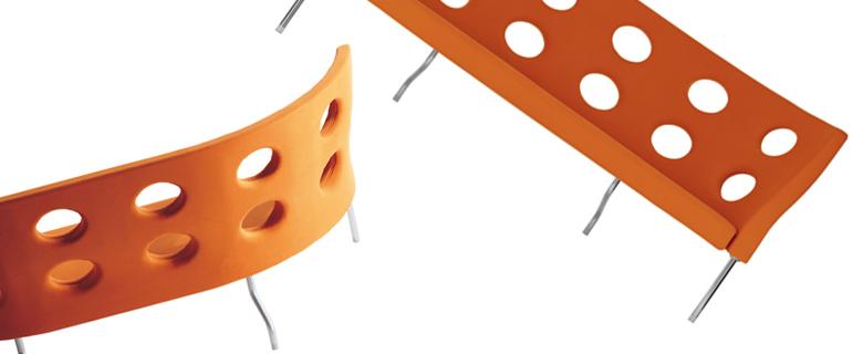 aliasdesign.itThe lines, arched both in plan and in elevation, facilitate the free arrangement of these upholstered sofas in the living spaces and increase the use of space as the sofas can be arranged in the corners or in the center of a room. The elliptical wholes in the backrest lighten the perception of dimensions and incentivate different uses. The seat and back proportions allow many different uses. Shape and proportions facilitate the gathering in isles where it is possible to stay, to converse, to eat and to work.