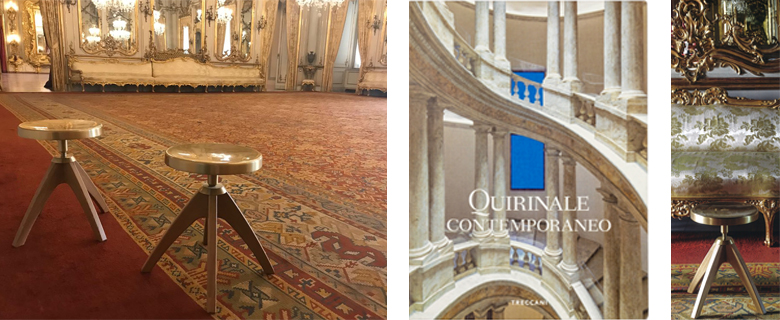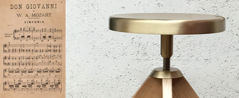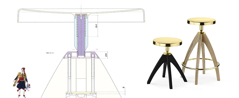 ghidini1961.comAl centro del progetto degli sgabelli รจ la spirale verticale della vite che ne consente la regolazione in altezza e mette in relazione dinamica la struttura curvilinea delle gambe in legno massello con la seduta rotonda in pressofusione di ottone.
