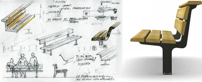 Sturdy and comfortable, stout and simple, clear, well-proportioned, traditional and modern at one time, almost neutral but welcoming and suitable to invite the busy milanese who is always hurrying somewhere, at least for a brief stop. Two sturdy T-section cast iron support stands hold six hardwood staves. Wood is a natural material that ages well, fresh in summer and warm in winter, pleasing to the touch, confortable to the seating, soft to the knock, all along the years present in the city of Milan.