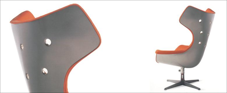 In this armchair the most important innovation is the attempt to lighten the traditional cumbersome shape of the upholstered armchair, both in weight and in visual impact in the room. The use of a ring instead of the traditional capitonné button, to nail down the leather to the body, provides both aeration from the backrest and a surprising visual transparency that makes the traditional heavy and cumbersome armchair look light and airy.