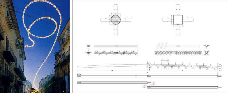 Illuminations in the arab quarter “Kalsa” in the old town center of Palermo. A 150 mt long light line coils in the air and visually builts a bridge between the big figtree of “Piazza Marina” and “via Alloro“. Manufactured with the traditional technology for illuminations, the line plays with the architecture of the street and invites for a visit to the neighborhood. Six circular arches combine with the main line and form, through the process of anamorphosis, when seen from a specific point of view, the word “KALSA”.